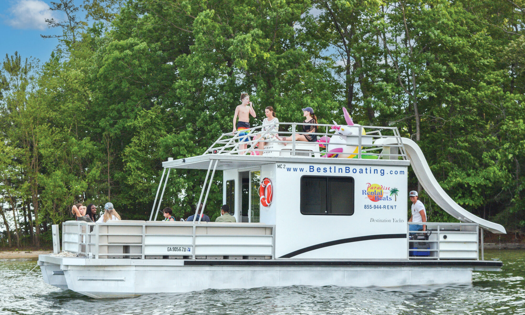 Destination Yachts are perfect for excursions on the water and provide an unparalleled lake experience. With a wet bar, waterslide, and upper deck, let loose and unwind as you take in gorgeous lake views all around you.