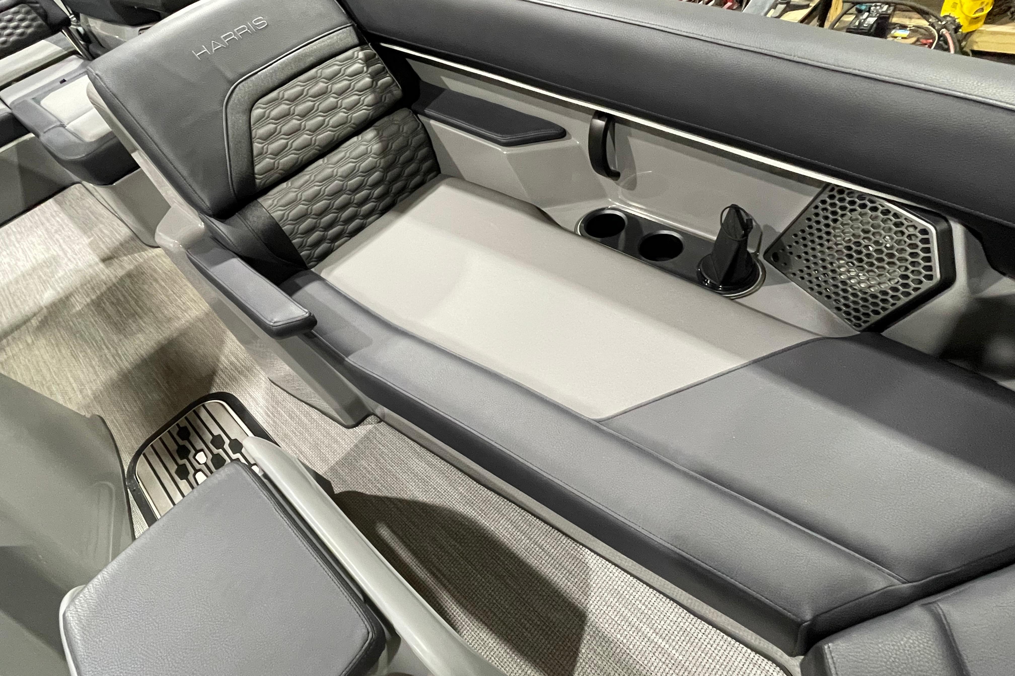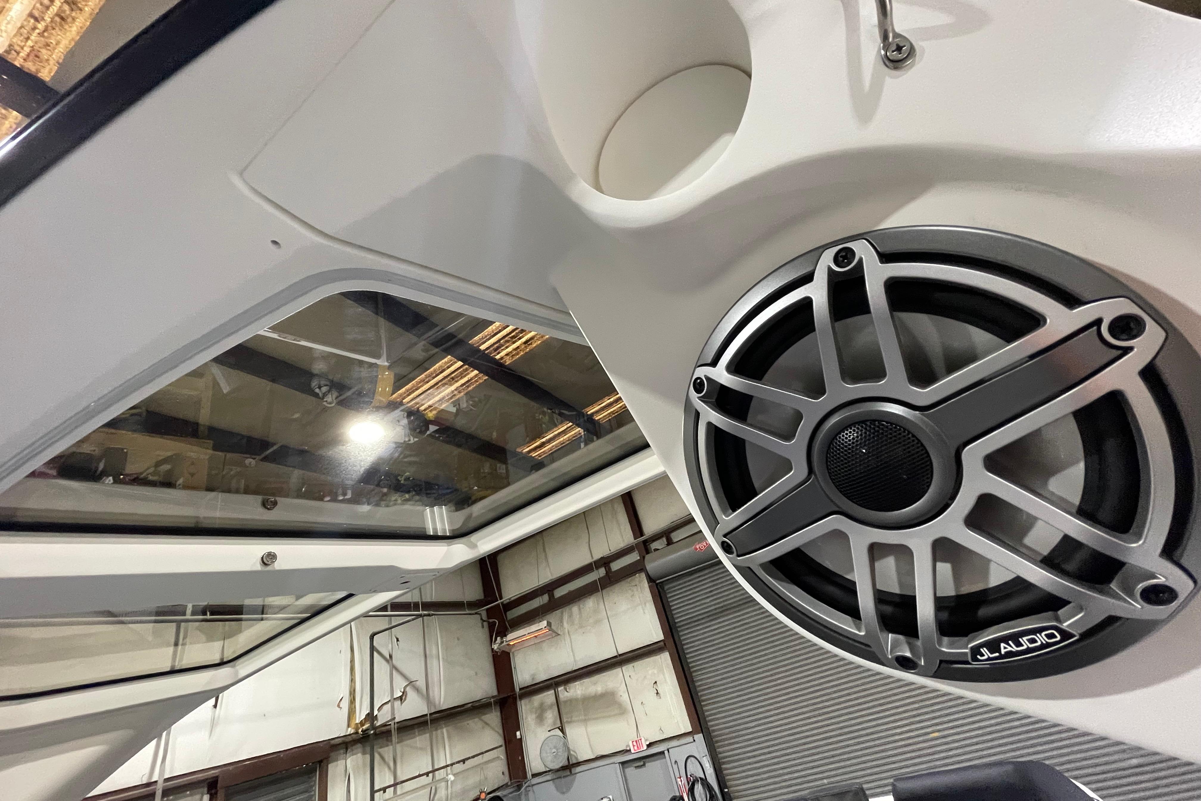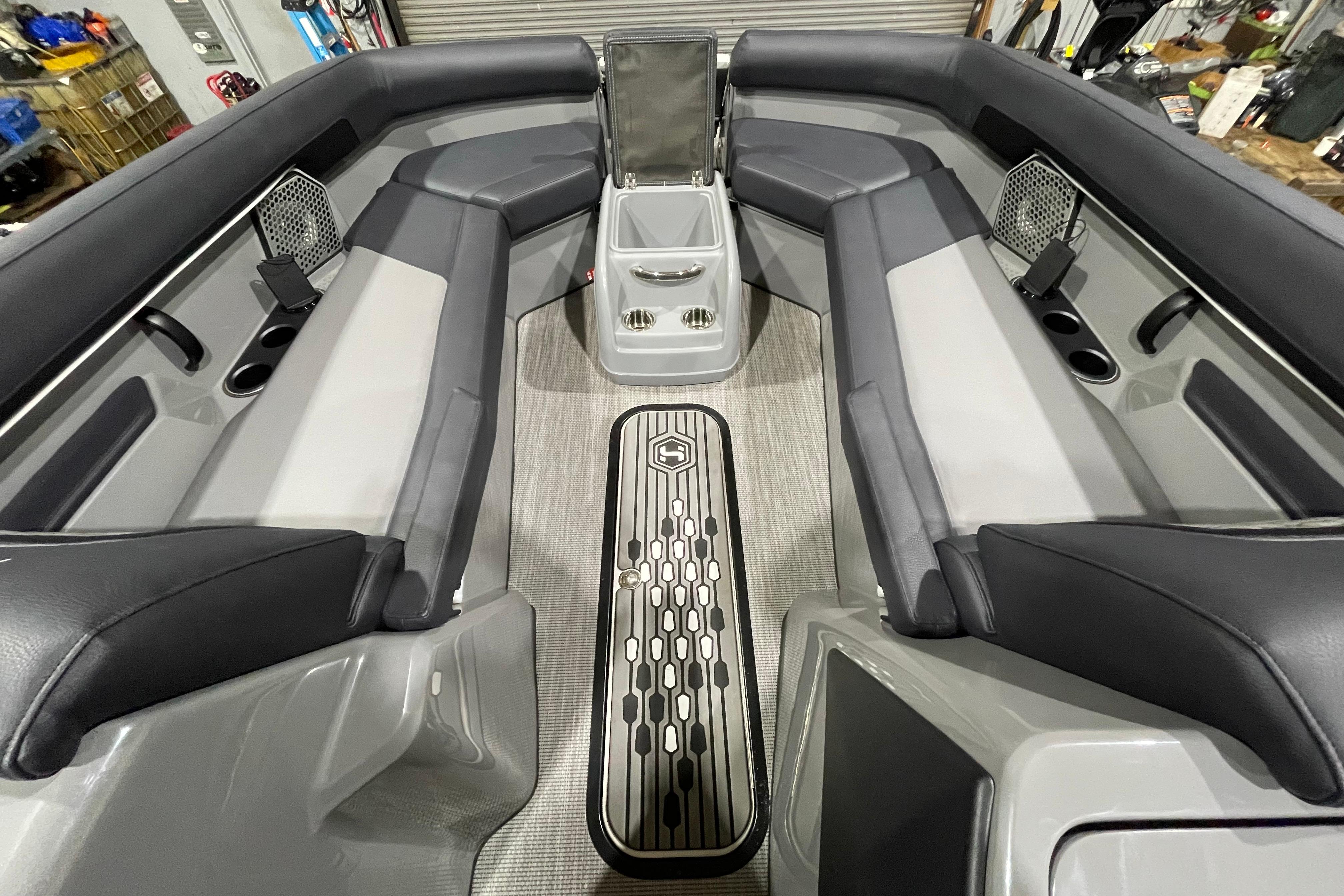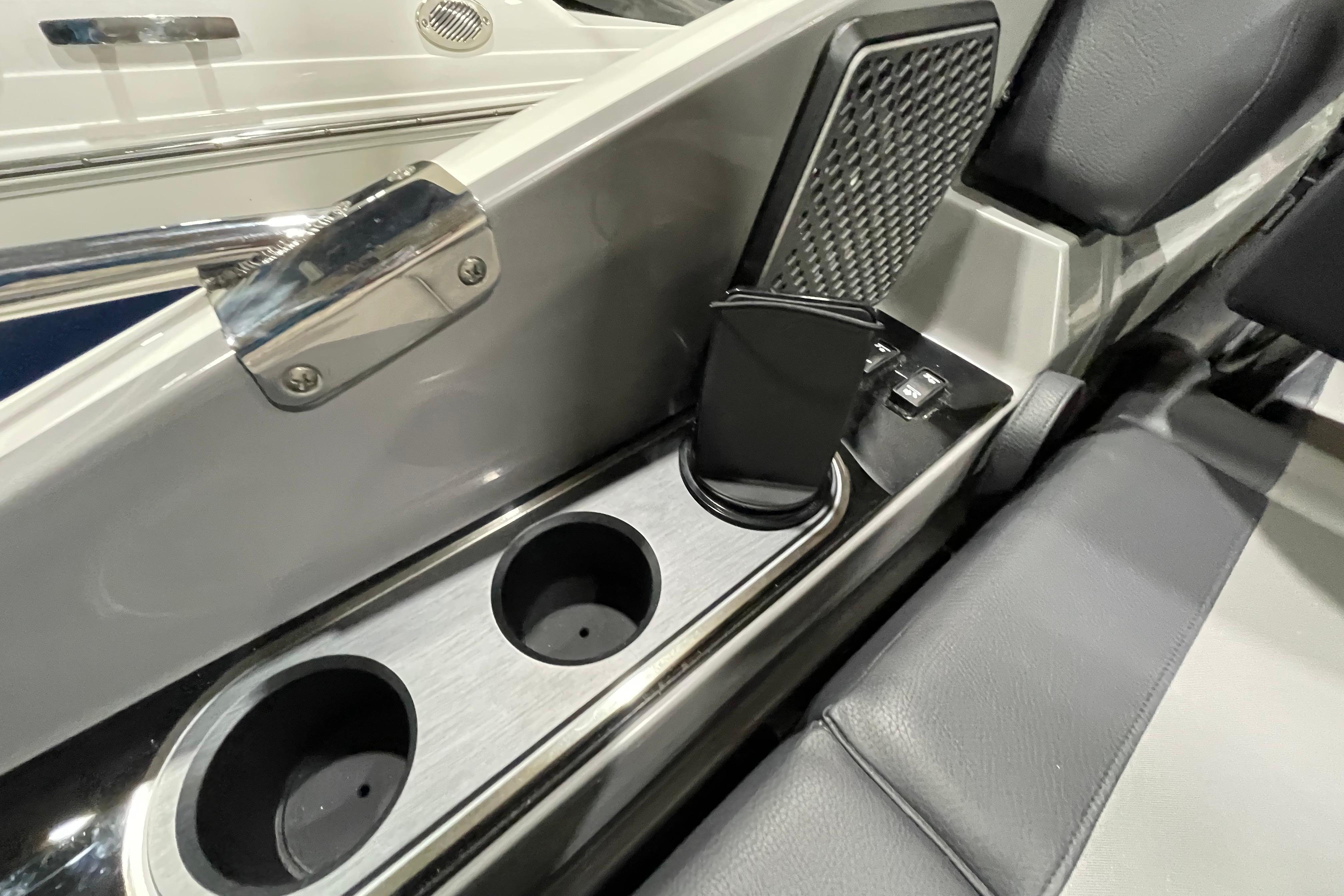Command the water from the luxury high‑back helm seat, complemented by dual NSX12 displays for next-level navigation and control. The JL Platinum Elite stereo system surrounds the boat with crystal‑clear sound, while the Total Light Package with C‑Zone sets the mood with premium interior and exterior lighting.