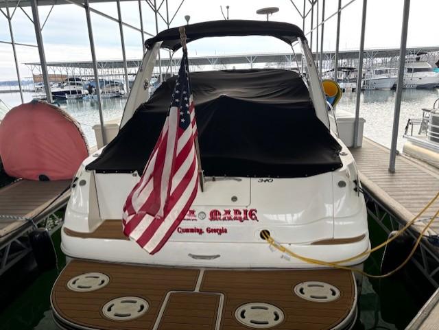 The 340 Sundancer has a large cockpit, a well-appointed cabin, and a serious base power plant, to summarize Sea Ray’s finest sport cruiser. Designed for entertaining on a higher scale, the 340 Sundancer features a portside entertainment center complete with wet bar, cooler and icemaker. An optional refrigerator is available in lieu of the icemaker. The cockpit table converts easily to a spacious sun pad by inserting the matching filler cushions. With high-quality marine-grade vinyl, every seat is amazingly comfortable, from the adjustable helm seat with flip-up thigh-rise to the full aft-facing seat with a convenient storage base and cooler. There’s also comfortable aft bench seating. Other standards include a self-bailing fiberglass cockpit liner, snap-in carpet, cockpit bolsters and more. Extra gear is neatly stored in an enclosed storage compartment located in the transom wall and equipped with a gas-assisted lid. The Sea Ray 340 Sundancer is impeccably styled to a level only Sea Ray can achieve. The vinyl and carpet have been recently replaced. A standard fiberglass sport spoiler and generous wood accents (including a wood-accent tilt steering wheel) conjure images of a fine yacht. At the helm, the captain has a broad dash that places everything in easy sight and reach, including illuminated weatherproof rocker switches, standard Raytheon VHF radio, digital depth finder, compass, and full backlit instrumentation with a concealed circuit breaker panel. Under the electrically operated engine hatch, the new standard 310 horsepower twin MerCruiser V-drives provide an exceptional ride with responsive handling, thanks in part to the heavy-duty hydraulic steering. The 340 Sundancer also offers a selection of optional twin gas and diesel stern drives, as well as twin gasoline and diesel V-drives. A large sliding acrylic door opens into a cabin that accommodates up to six people on the Sea Ray 340 Sundancer: deep-pile marine carpet, floor storage, flat screen tv, and a Clarion AM-FM digital cassette stereo with six-disc CD changer and eight speakers. The forward stateroom has a full-size berth with two hanging mirrored lockers, a vanity, and plenty of personal storage space. The mid stateroom features Sea Ray’s design in which the conversation pit converts to a private double berth. In the salon, a choice of seating plans allows for even more sleeping space with a convertible dinette, or a stylish couch and table with storage below. The galley of the 340 Sundancer features all the comforts of home, including a 3.4-cubic-foot refrigerator, microwave, flush-mount two-burner electric stove, and fiberglass countertop with sink and cutting board cover to create even more usable space. The drawers and storage areas stow dishes, glasses, and flatware securely thanks to special inserts that hold them firmly in place. The fiberglass enclosed standup head with vanity provides a VacuFlush head and shower. The pressure water system and six-gallon water heater make sure that hot water is always available. A carbon monoxide monitor is standard equipment. Among the 340 Sundancer’s many other conveniences are a Sunbrella Bimini top and sunshade, which when installed still allows plenty of head room at the helm. An extended swim platform with concealed stainless-steel ladder allows for clutter-free boarding access from the water. There is also dockside power, fresh water washdown with a hot and cold cockpit shower and dockside inlet concealed in the transom. A long options list offers even more ways to customize the 340 Sundancer, including a 12,000 BTU air conditioner and heater, plus a choice of remote-start gas or diesel generators. This well-kept yacht included a customer reclining sun pad, and custom cover. Do not miss your chance to make long lasting memories on the lake. Come see this 2000 Sundancer 340 at Port Royal on Lake Lainer.
